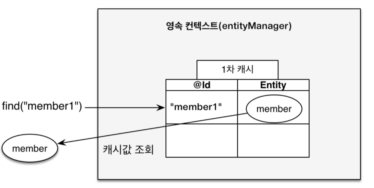 1차 캐시에서 식별자 값으로 엔티티를 찾는다. 만약에 1차 캐시에 엔티티가 존재한다면 굳이 데이터베이스까지 들어가지 않아도 메모리에 있는 1차 캐시에서 엔티티를 조회한다. 1차 캐시가 존재하는 장점 중에 하나이다.