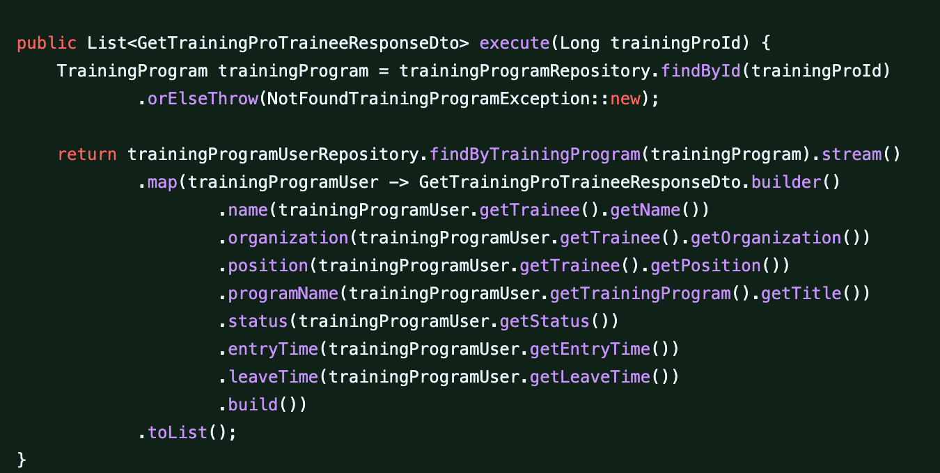 위와 같은 코드는 연수 프로그램별 연수자의 출석 현황을 불러오는 코드다. 빌더를 사용해서 반환할 객체를 생성하는 것을 볼 수 있는데 자세히 보면 다른 엔티티의 정보를 가져오는 것을 볼 수 있다. 이렇게 되면 N + 1이 일어날 수밖에 없는 로직이다.