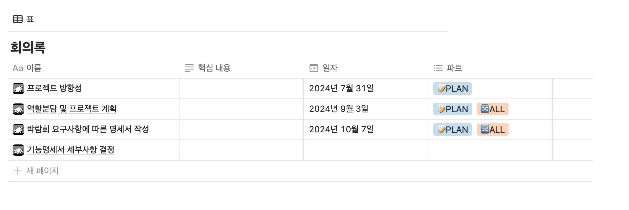 실제 노션에 문서화되어있는 회의록이다. 이걸 보면 알 수 있듯이 진행한 지 2달이 넘은 현재.. 회의록을 보면 4개가 끝이다. 이후에는 각자 바쁘고 그래서 회의를 진행하지 않았다. 내 기억으론 한두 번 하긴 했지만 문서화를 하지 않았다. 어떤 일이 벌어질지 모르고..