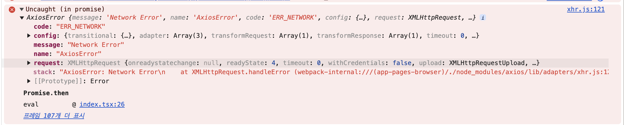 현재 프로젝트에서 뜨는 에러이다. 401이 뜬다면 NetworkError가 뜬다. 이걸 해결하려고 초반에 원인을 찾아봤는데 해결하지 못했다. 클라이언트 문제인지 서버 쪽 문제인지 정확히 확정 짓지 못해서 임시로 나누고 저 문제가 안 생기게 핸들링을 해놓은 상태이다. 이후에 해결해야 될 문제이다.