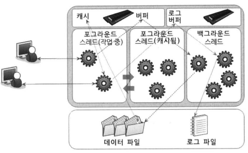 다시 본론으로 가서 포그라운드 스레드는 주로 각 클라이언트 사용자가 요청하는 쿼리를 처리하는 역할을 한다. 요청을 처리하고 난 후에는 스레드 캐시로 돌아가게 되는데 만약 스레드 캐시에 정해놓은 스레드 개수가 이미 충족했다면 스레드를 아예 종료해 버린다. 스레드 개수는 thread_cache_size 시스템 변수로 설정할 수 있다.