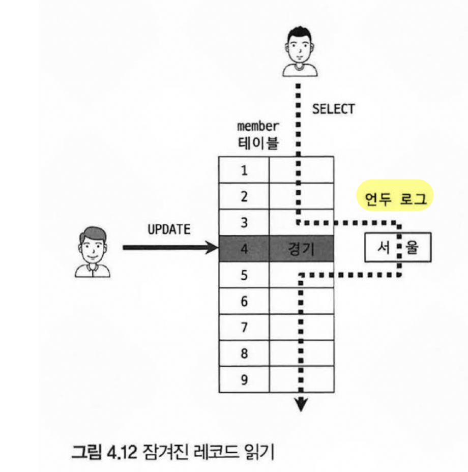 위에 이미지를 보면 누군가 UPDATE를 한 것을 볼 수 있는데 그럼에도 불구하고 SELECT를 한 사람은 전혀 영향끼치지 않고 읽기 작업을 수행한 것을 볼 수 있다. 이것을 잠금 없는 일관된 읽기라고 말한다. InnoDB에서는 변경되기 전 데이터를 읽기 위해선 언두 로그를 사용한다.